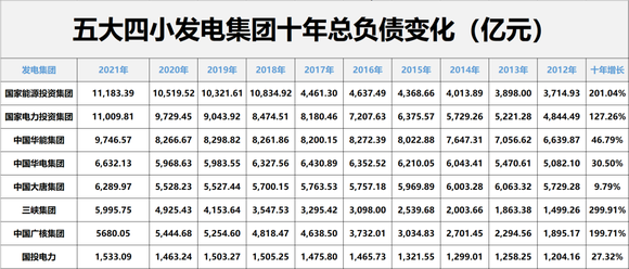 十年间,4家发电集团总负债增长在100%以上,依次为三峡集团,总负债增长299.91%;国家能源投资集团,增长201.04%;中国广核集团,增长199.71%;国家电力投资集团,增长127.26%。