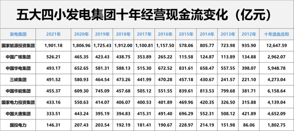 近十年间,五大四小发电集团合计造血(经营现金流净额)4.43万亿元,其中国家能源投资集团合计造血1.26万亿,造血力高居第一位。