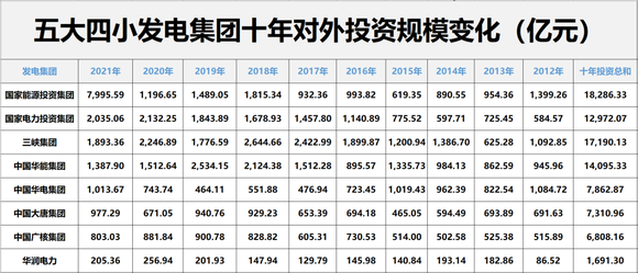 同时,近十年五大四小发电集团合计对外投资8.78万亿。其中,三峡集团、国家电力投资集团、中国华能集团、国家能源投资集团对外投资规模均在1万亿元以上。