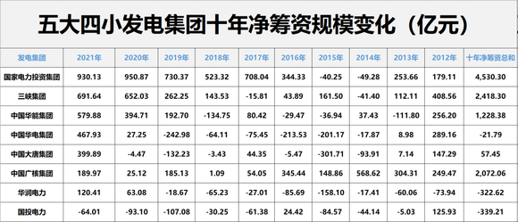 近十年间,五大四小集团合计净筹资(筹资现金流净额)5616万元。具体到企业层面,十年间五大四小发电集团中有5家企业净筹资为正,其中唯有中国广核集团净筹资现金流连续十年以上保持资金净流入。