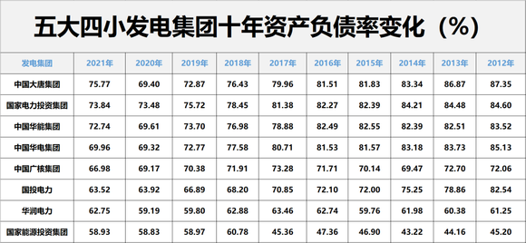 截止2021年末,五大四小发电集团总负债合计近6万亿,整体资产负债率为66.27%。其中,国家能源投资集团和国家电力投资集团总负债规模均在1万亿以上。
