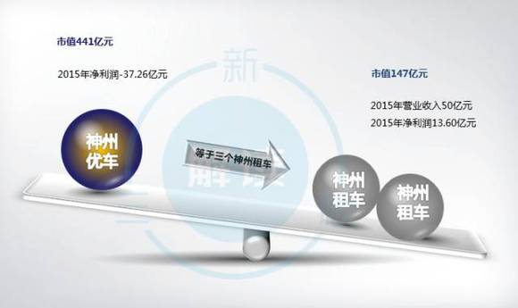 于是我们看到,神州租车去年收入50亿元,净利润14亿元,估值跌到只有147亿元人民币;新三板的神州优车去年亏损37亿元,现在市值却高达441亿元。