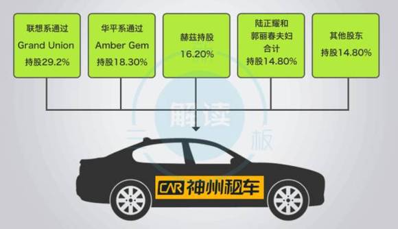 神州租车上市之后,联想系通过Grand Union 持股29.2%,华平系通过Amber Gem持股18.30%,赫兹持股16.20%,陆正耀和郭丽春夫妇合计持股14.80%。