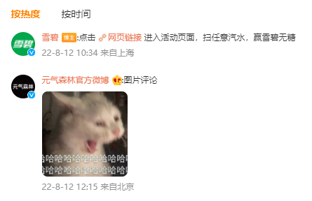 随后,元气森林在其广告下评论表情包“哈哈哈哈哈哈....”疑似回应,并于次日发布含有雪碧广告片段的视频回应:“听我说,谢谢你的广告”。
