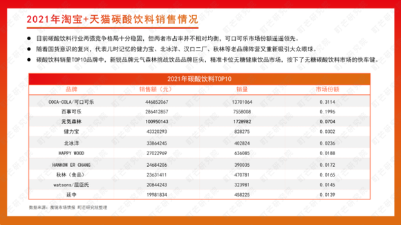 从电商渠道的碳酸饮料销售数据上看,元气森林正缩小与可口可乐、百事之间的距离。根据町芒研究院发布的《2022无糖饮料行业研究报告》显示,在淘宝、天猫平台上,元气森林以超1亿元的销售额,位列2021年碳酸饮料销售前10名榜单,仅次于可口可乐与百事可乐。