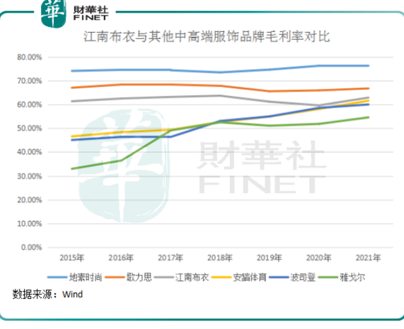 对创意的追求,令江南布衣的产品在市面上拥有了更强的溢价能力,因此毛利率相当高,碾压很多一线品牌。