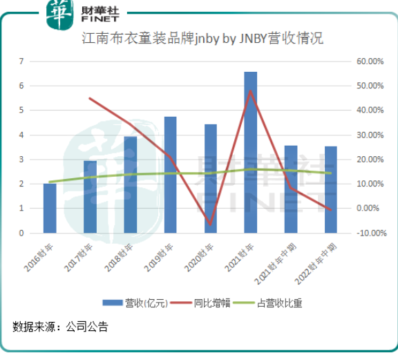 首先是童装业务的业绩。在受“童装事件”冲击的2022财年中期,江南布衣旗下童装品牌jnby by JNBY营收失速,当期产生营收3.55亿元,同比下降0.7%,而上年同期营收取得8.3%的增幅。