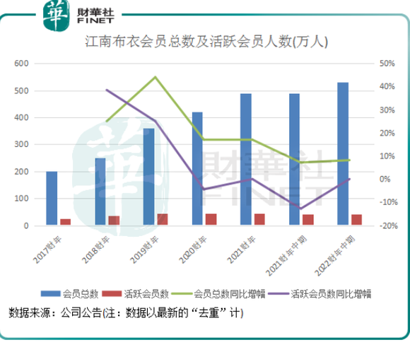 活跃会员方面,2022财年中期,江南布衣的活跃会员为约41万人,与去年持平,2020财年和2021财年则分别下降4.4%及持平。
