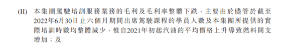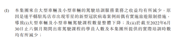 向中国际在业绩预告中提到,集团来自大型车辆及小型车辆的驾驶培训服务业务的收益均有所减少,原因是遂平县驻马店市出现零星的新型冠状病毒案例而偶有实施旅游限制措施,导致大型车辆及小型车辆驾驶课程数量整体下降。同时,截至2022年6月30日止6个月期间,出席驾驶课程的学员人数及集团所提供的实际培训时数均有所减少。