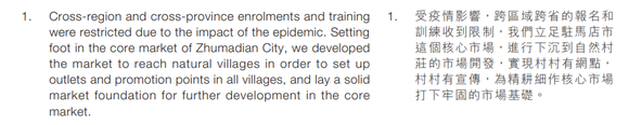 向中国际的主要销售策略是立足核心市场,进而向下沉市场和周边市场辐射。其在财报中提到,“我们立足驻马店市这个核心市场,进行下沉到自然村庄的市场开发,实现村村有网点,村村有宣传,为精耕细作核心市场打下牢固的市场基础。”