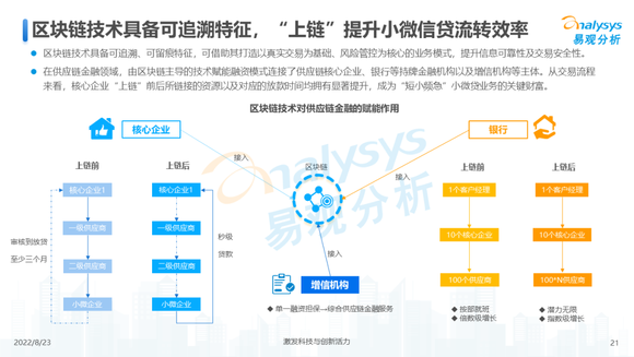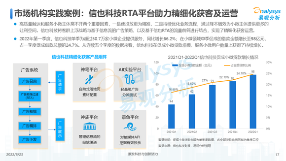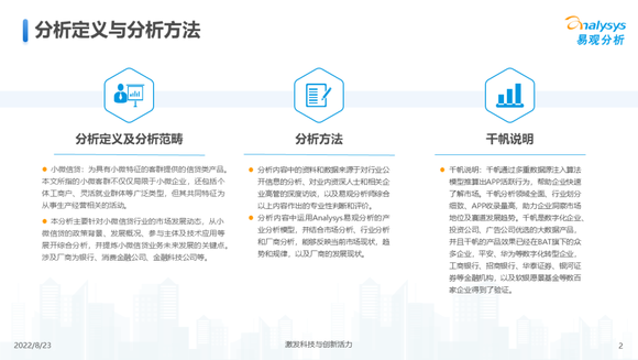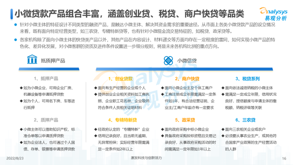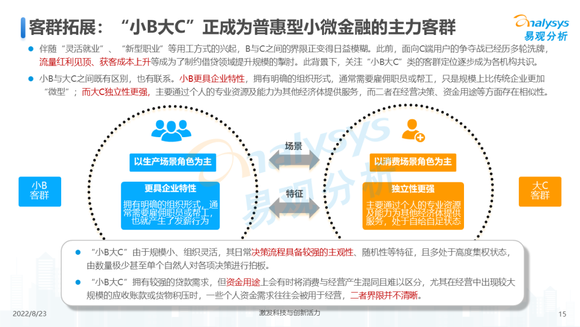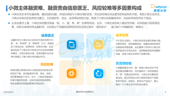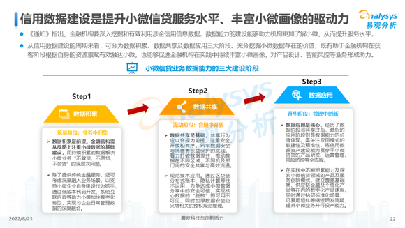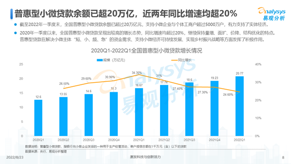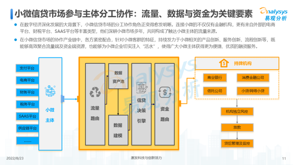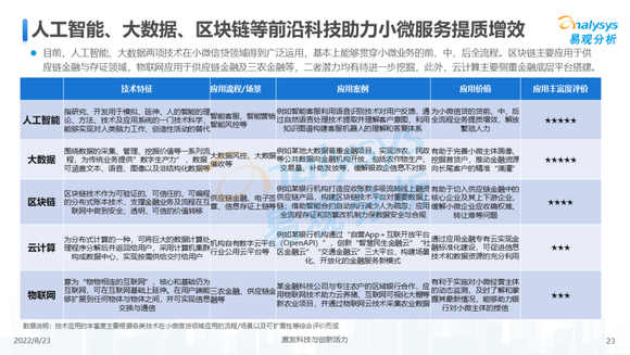《数字经济全景白皮书》持续关注小微信贷市场。2022年以来,央行、银保监会等金融监管部门持续加大引导机构对实体经济的扶持力度,强化”滴灌“作用,在此背景下,各机构纷纷发力小微信贷业务。小微信贷主要面向具有小微特征的客群,涵盖小微企业、灵活就业群体、个体工商户等丰富类型,参与的市场机构主体有商业银行、消费金融公司、金融科技公司等。本分析主要针对小微信贷行业的市场发展动态,从小微信贷的政策背景、发展概况、参与主体及技术应用等展开综合分析,并总结和提炼出小微信贷业务发展的关键点。未来,小微信贷业务需进一步运用精细化运营的思路,例如通过产品创新、服务创新、流程创新等手段,切实为小微主体注入更多的资金“活水”,让广大小微主体获得更加便捷、高效、优惠的融资服务。