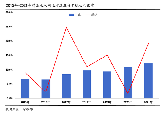 再如,非税收入中的罚没收入近年来增长较快,且占比有上升趋势。财政部数据显示,2021年,罚没收入同比增长19.2%,增速较2020年提高了17.5个百分点,占非税收入的比重从2020年的10.9%上升至12.5%,占比连续两年扩大。