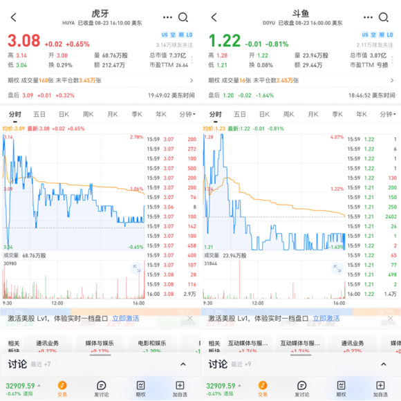 资本市场也给出消息信号。截至8月24日收盘,虎牙报每股3.08美元,市值为7.37亿美元;斗鱼报每股1.22美元,市值仅剩3.87亿美元。要知道,虎牙和斗鱼原本总市值超过155亿美元,现在却只剩下零头。
