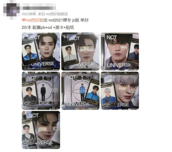 有些公司还会发行限量卡以此刺激粉丝消费。2020年,SM娱乐公司曾在NCT完全体大队回归时期发行随机限量银卡。