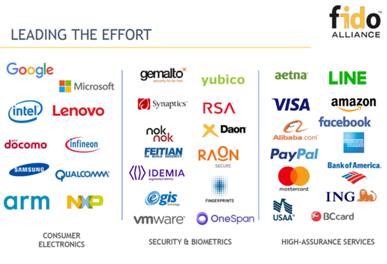 这里就要提到FIDO联盟,即Fast Identity Online,快速在线身份识别联盟。该联盟成立于 2012 年 7 月,旨在通过“一组开放、可扩展、可互操作的机制和更强大、更私密的身份验证标准,来减少对密码的依赖”。FIDO的标准草案介绍了FIDO认证协议的工作原理。用户可以使用智能手机指纹采集器、USB令牌等多种方式登录,服务商无需再维护复杂且成本高昂的认证后台。