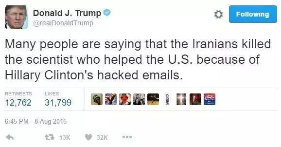 这下,希拉里又被川普揪住了“小辫子”。他开启了自己非常喜爱的“许多人说”的造句模式,发了一条推特:“许多人说,伊朗人杀害为美国做事的科学家,都是因为希拉里电邮遭黑。”