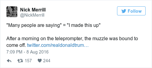 希拉里阵营随即反驳,说川普是在“造谣”。希拉里发言人梅丽尔发推特说:“‘许多人说’,等于‘他在乱说’。”