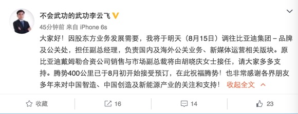 8月14日,比亚迪戴姆勒合资公司销售与市场副总裁李云飞通过认证新浪微博称,因股东方业务发展需要,其将于明天(8月15日)调往比亚迪集团-品牌及公关处,担任副总经理,负责国内及海外公关业务、新媒体运营相关版块。原比亚迪戴姆勒合资公司销售与市场副总裁将由胡晓庆女士接任。