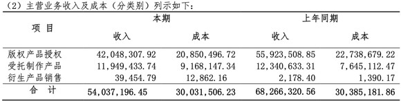 报告期内,版权产品授权收入4204.8万元,较去年同期减少了24.81%,受托制作产品收入1194.9万元,较去年同期减少了 3.17%,主要是受北京疫情影响,延迟了合作合同的签署和产品交付时间,延迟了收入确认时间;衍生产品销售收入3.9万元,较上年同期增加了1711.18%,主要是增加了新的衍生产品带来的收入。