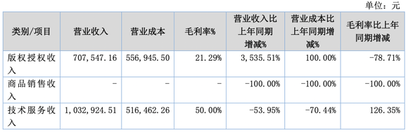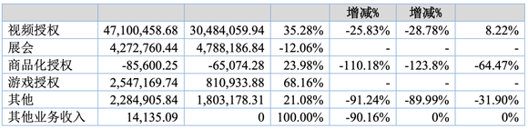 星原文化来自版权授权收入70.75万元,同比增长3535.51%,主要原因是报告期内动漫播放授权费增长所致。毛利率同比下降78.71%,主要原因是本期版权是动漫播放授权费,上年同期系孙公司星杰的授权收入,授权费已摊完,不存在成本。
