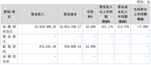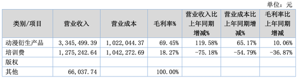 动漫衍生品收入是公司主要收入,达到334.55万元,同比增长119.58%,收入增长主要是动画带动的衍生产品的销售的增加,培训收入127.52万元,收入比上年同期下降75.18%,主要是受疫情影响,线下托育园所根据疫情阶段性暂停影响所致。