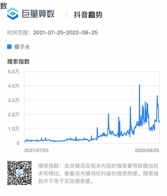 椰子水属于茶饮界今年的一个热点产品。从巨量算数的抖音指数能看出,进入2022年之后“椰子水”热度快速增长,到今年夏季达到顶峰。在小红书上,和“椰子水”相关笔记有20万+篇。