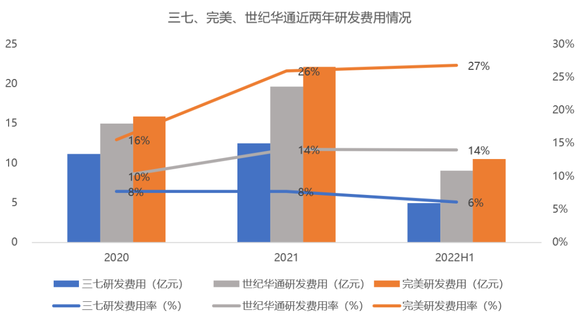 今年以来,大部分游戏厂商死磕研发,加大研发投入。上半年,完美世界、世纪华通研发费用率分别为14%和27%,而三七互娱研发费用率只有6%。