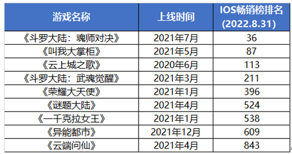 截至目前,三七互娱近两年上线的新游只有《斗罗大陆:魂师对决》、《叫我大掌柜》还在IOS畅销榜前100,《云上城之歌》排在113名,其余游戏已经跌出了前200名。