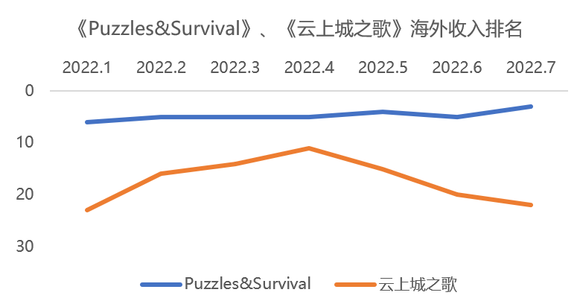 至于另一款SLG手游《Puzzles &Conquest》,截至2022年7月,最高单月流水超5500万,累计流水已达12.3亿。MMORPG手游《云上城之歌》在日韩市场表现优异,今年2月韩国营收超1亿元。