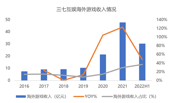 上半年,三七互娱国内业务营收50.59亿元,同比下降7.91%,海外业务营收30.33亿元,同比增长48.33%。三七互娱海外收入增速远高于中国音数协游戏工委公布的2022上半年我国自主研发游戏海外市场实际销售收入6.16%的同比增速。