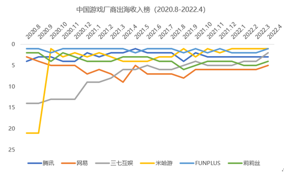 从排名来看,三七互娱出海收入挤进前五。data.ai数据显示,三七互娱从10名开外跻身前五,今年4月甚至杀入榜单第二名。