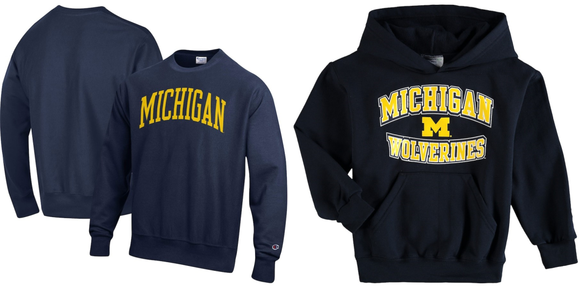 Champion 与密歇根大学合作的联名款以连帽衫、圆领衫为主,配色是学校标志性的蓝黄色,深蓝色衣服胸口印刷着黄色logo “MICHGAN”,十分醒目。