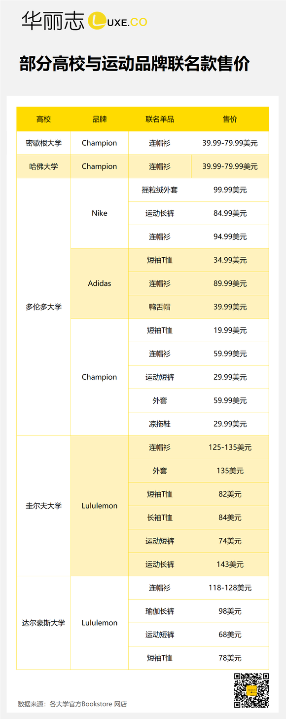 历来无论是高校自己的篮球队、橄榄球队等运动队,还是校际体育赛事,运动品牌都是首选的合作伙伴或赞助方。延续这一传统,高校在联名款的合作方上,也偏向于专业运动品牌,如 lululemon、Nike 等,或以运动服饰闻名的时尚品牌,如 Champion、OVO 等。考虑到高校的声誉与地位,它们在选择合作方时也非常谨慎,某种程度上合作品牌需要契合学校自身的实力与调性。