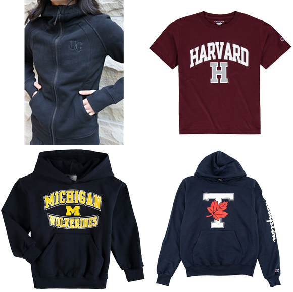 这些高校联名款特征十分明显。款式以连帽衫、T恤等运动休闲服饰为主,颜色多选择大学的代表色,胸前的学校 logo 印花鲜明夺目,极具辨识度。