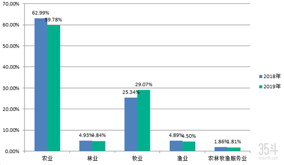 图:2018-2019年重庆市农林牧渔业产值占农林牧渔业总产值占比情况,数据来源:重庆市农业农村委