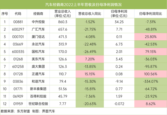 界面新闻梳理了12家A股和港股汽车经销商上市公司半年报,7家公司营收和净利双降,其中庞大集团净利同比下降超九成,和谐汽车净利同比下降超300%,4家公司净利实现增长,仅正通汽车营收和净利双增长。