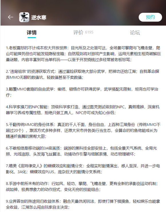 不仅如此,介绍中还列举了足足12条颠覆性的游戏特性,包括“不计成本的宏大开放世界”、“不敢相信是移动端的3A级画质”、“媲美《底特律变人》的蝴蝶效应和剧情分支”等等,如果你不太了解《逆水寒》一贯“沉迷戏精无法自拔”的宣传方式,可能一时分不清游戏是真厉害还是反串黑。