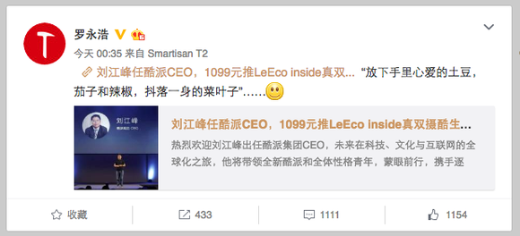 8月16日,罗永浩白天现身乐视酷派发布会,晚上便在微博转发了贾跃亭的一条公众号文章,并配上这样一句话“我决定放下手里心爱的土豆、茄子和辣椒,选择创造一个全新的移动互联的未来”,这正是酷派新人CEO刘江峰在发布会上的发言。至此,所有人似乎都已经认定“锤子卖给乐视”了。
