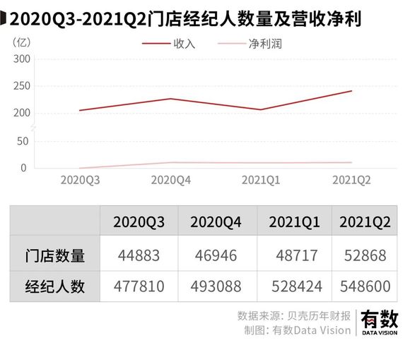以2021年Q2为截面,前一段时间贝壳所有指标都在持续向好,2020年Q3,贝壳GTV达到10500亿,收入205亿,坐拥4.5万家门店与48万个经纪人首次实现盈亏平衡,赚了7500万。