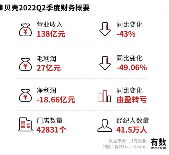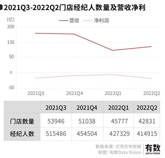 直到2021年的冬天,贝壳也熬不住了,今年二季度净亏损18.66亿元的寒冬下,贝壳经纪人相比去年同期减少了:13万人。