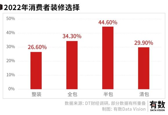 但根据DT财经调研数据显示,截至2022年8月选择整装的人群仅为26.6%,而选择半包为主的装修方式为44.6%依旧是主流,而且根据各个家居公司财报显示,整装目前带来的营收占总营收也均不足10%。
