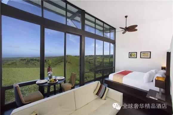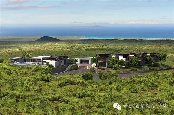 酒店独特的位置,造就了壮丽的景观。环境独特的Pikaia Lodge建造在加拉帕戈斯圣克鲁兹岛(Santa Cruz)的一座死火山口上,海拔高度有450米。所有14间客房和别墅,都能尽览森林草原和热带雨林之间的美景。躺在沙发床或无边泳池,浓浓绿意的草原、仙雾缭绕的森林、火山和大海一览无余。