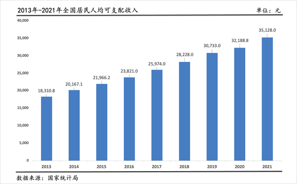 在企业税负和个人税负并举降低的双重加持下,多年来,居民收入不断充盈。国家统计局数据显示,2014年,全国居民人均可支配收入突破2万元,2019年突破3万元,2021年人均可支配收入达到3.5万元以上。
