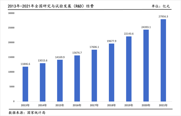 此外,在加大企业研发加计扣除政策的带动下,企业研发投入负担大大减轻,创新潜力大大激发。2012年,中国研发经费投入突破1万亿元,2019年突破2万亿元,2021年达到近2.8万亿元,预计2022年将超过3万亿元。