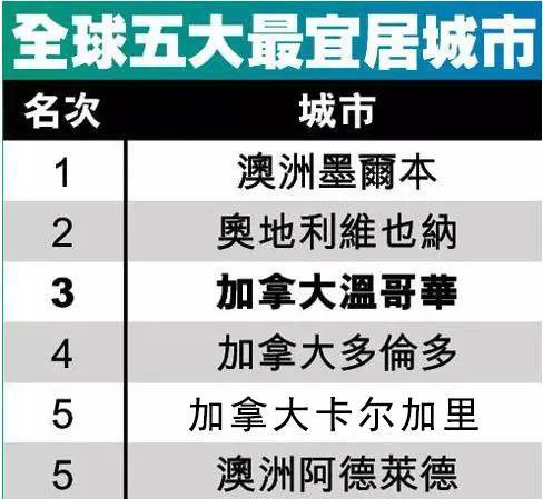 最终结果显示加拿大的城市质量让人住得更加舒心。全球140个城市最新调查中,温哥华名列世界最〝适宜居住城市〞第三名,卡尔加里和多伦多也名列前五名之中。报告指出,温哥华及多伦多在就业市场方面,表现特别强劲。