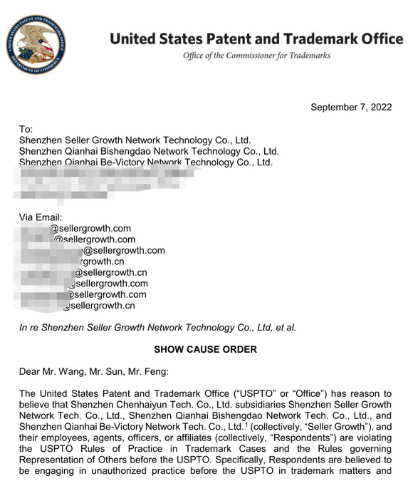在本次美国商标局(以下简称“USPTO”)公布的调查名单里,深圳两家知名商标代理机构——“卖家成长”、“前海必胜道”赫然在列。前述代理机构面临着被制裁的危机,他们为大批跨境电商卖家代理和提交的13000多个商标也迎来失效的巨大风险。