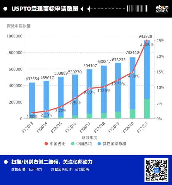根据官方公布的《USPTO 2021年度绩效与责任报告》披露的数据,2021年,全球向USPTO提出的申请量超过73.2万件,如果计算多项指定类别的商标申请,总量首次超过90万件,较上年增长27.9%。而这一增量中的61.5%都来自中国商标申请人。此外,中国申请人在美国商标总申请量中的占比从2013财年的2.3% 激增至2021财年的25%。