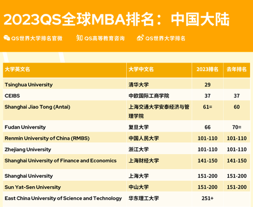 中国大陆今年有10个MBA项目上榜,同比增加了2个。有4个中国大陆MBA项目跻身前100名,上海交通大学安泰经济与管理学院排名上升,复旦大学排名下降。