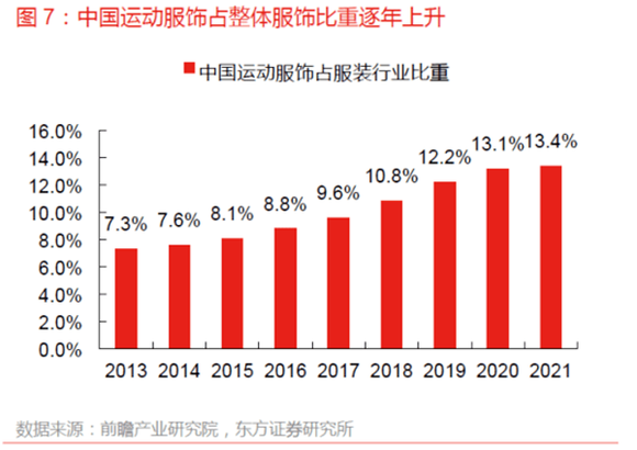 根据前瞻产业研究院数据,中国运动服饰占整体服饰比重逐年上升,已经从2013年的7.3%提升到2021年的13.4%。到2021年,中国运动服饰市场零售规模达3718亿元,同比增长19.1%。