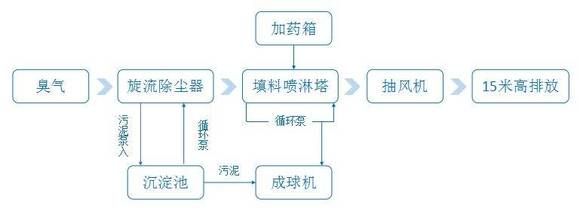 根据陈老板的公司和工艺处理情况,以及环保指标要求,两周内,万先生设计了一套处理系统。该系统采用湿式旋流除尘器+填料喷淋塔处理其废气中的颗粒物和气态污染物,湿式旋流除尘器的含尘废水通过沉淀池将颗粒物沉淀下来,上清液则循环使用,沉淀池定期清理,将清理出来的污泥倒入拌料机中进行固化稳定化。填料喷淋塔则采用植物提取液制成的高效除臭剂作为洗涤液,将废气中臭味去除。定期更换的洗涤液体作为飞灰固化用水。整个系统不外排废水。处理效果远远低于国家标准,检测浓度在人类臭味阀值以下。该系统的工艺流程如下:
